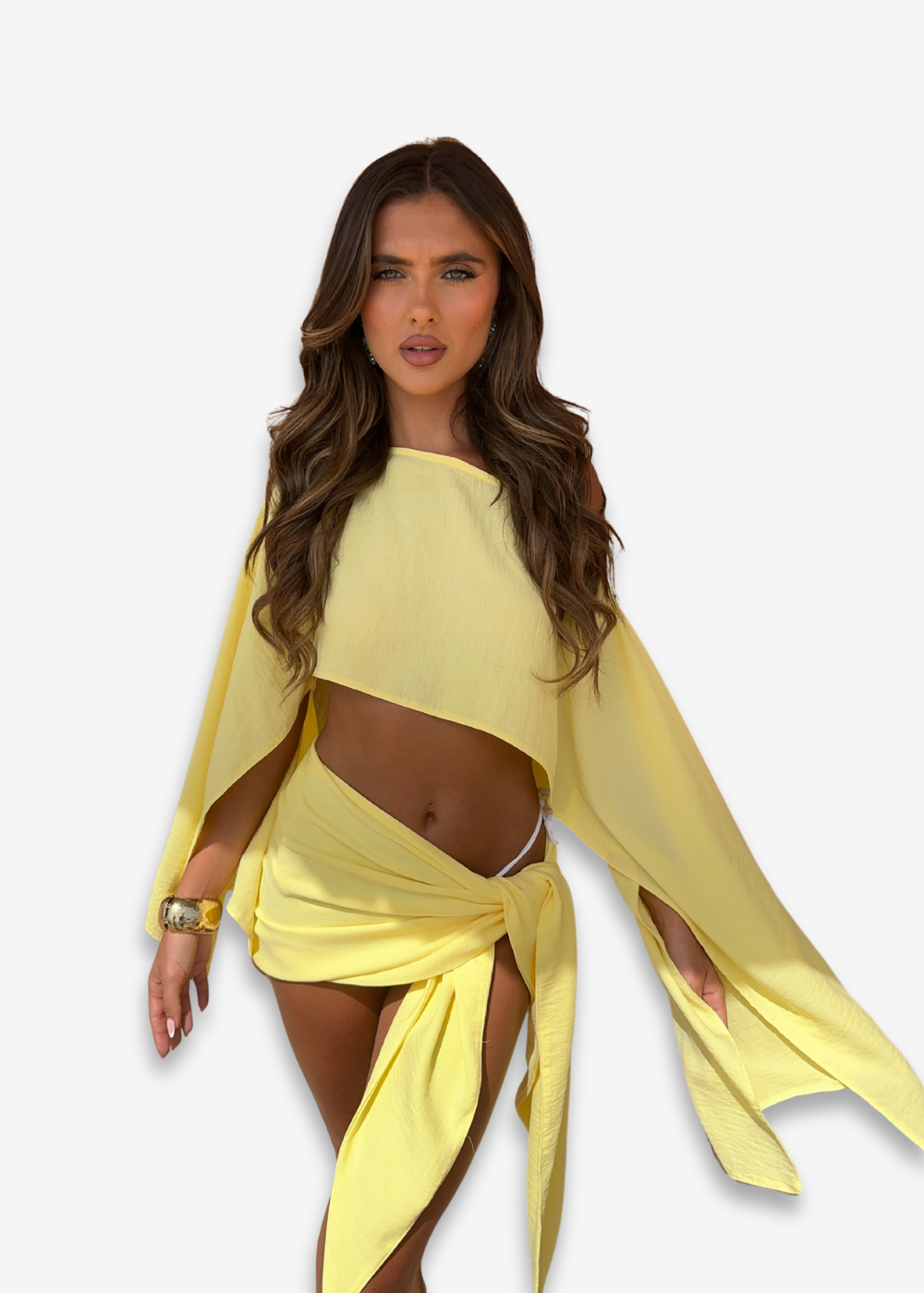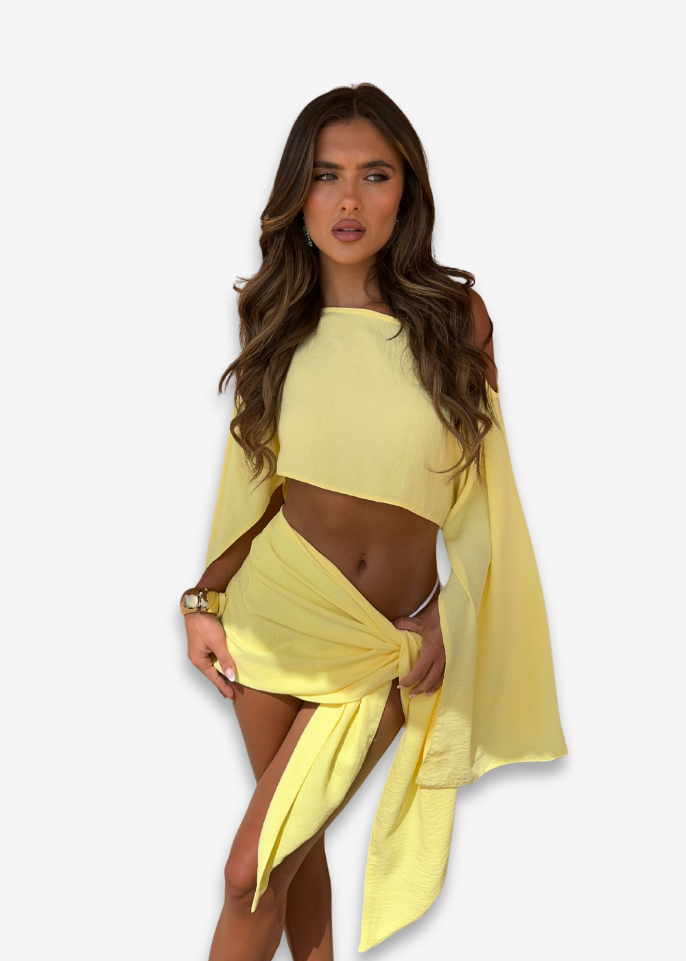 Añade un rayo de sol a tu armario con el Conjunto Sarong Carmen Lemon, un look refrescante creado para escapadas vacacionales y días de verano relajados. Este conjunto de dos piezas presenta un favorecedor top de hombros descubiertos y una falda pareo a juego, diseñados para realzar la piel bronceada y los momentos junto al mar. Tanto si vas a un brunch como si disfrutas de un atardecer costero, este set aporta un toque de encanto cítrico a tu estilo.