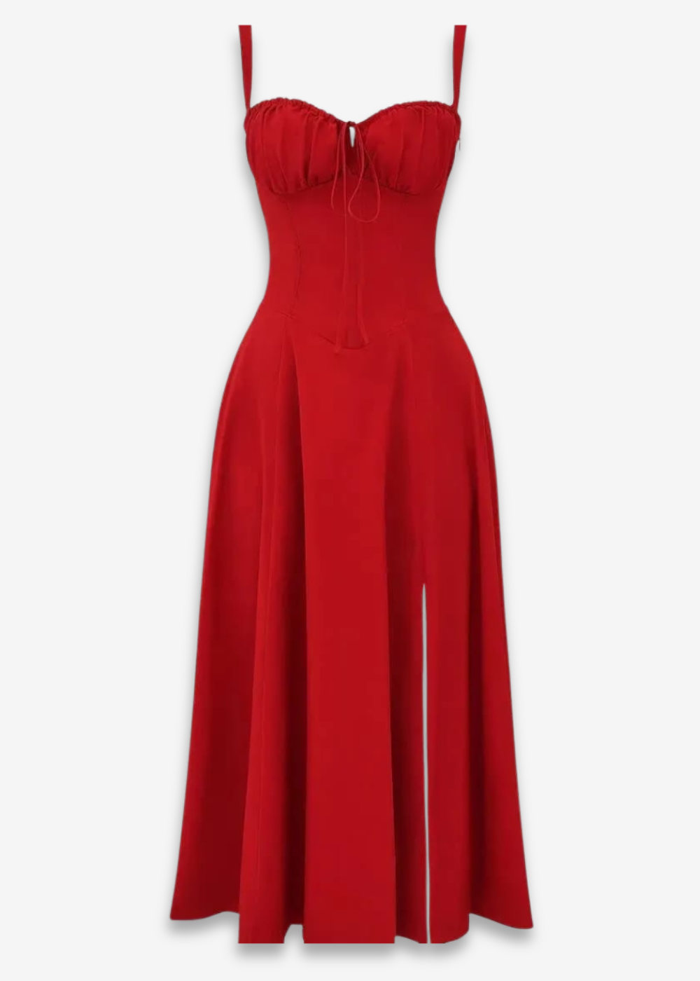 This Lucia dress features a tight bustier design with a beautiful tie-back design that cinches in at the waist. The tight bust is equipped with drawstring ties, and the side slit adds a touch of sexiness and shows off your legs. Side zipper for easier on and off. Hidden pockets do not spoil the elegant shape. It exudes your elegant and fashionable temperament.